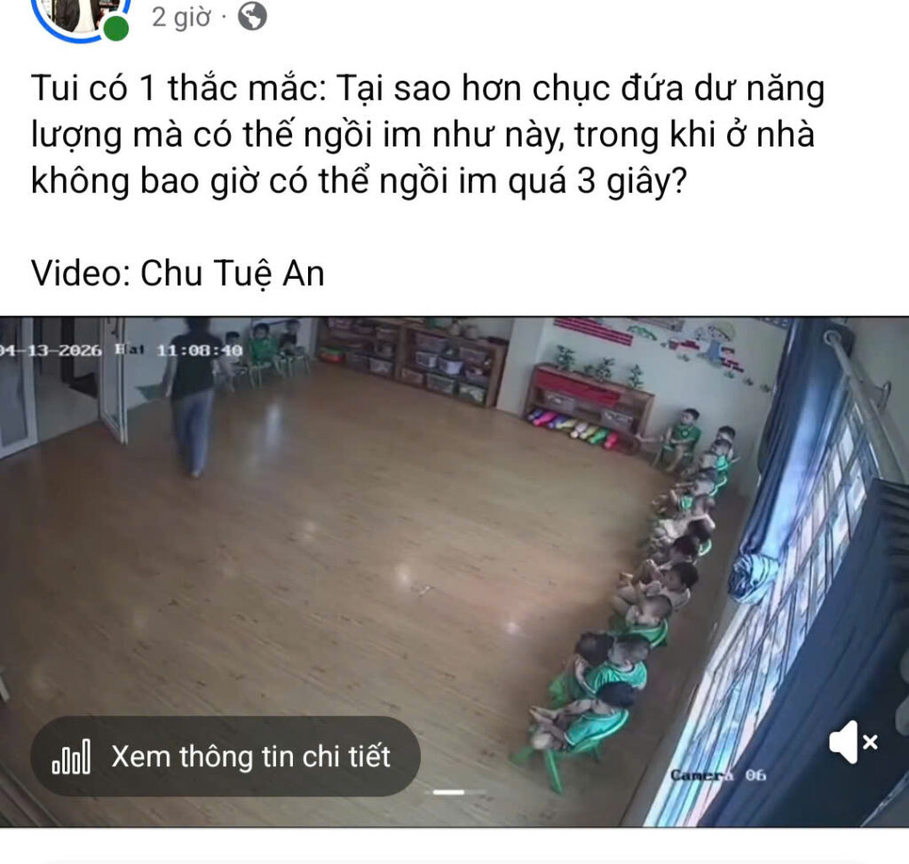 Gần đây, trên mạng xã hội lan truyền một video – bức ảnh trên cắt ra từ video – ghi lại cảnh tượng bên trong một lớp học mầm non. Hơn chục đứa trẻ – độ tuổi mà lẽ ra năng lượng phải luôn tràn trề, chạy nhảy không ngừng nghỉ – lại đang ngồi xếp hàng sát tường, tay khoanh trước ngực, im phăng phắc như những pho tượng nhỏ để nhìn cô giáo lau nhà.